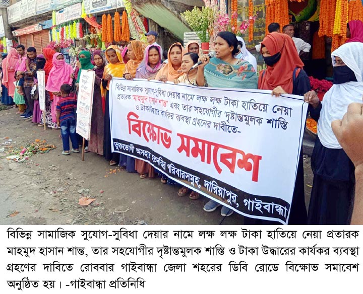 প্রতিনিধি গাইবান্ধাবিভিন্ন সামাজিক সুযোগ-সুবিধা দেয়ার নামে লক্ষ লক্ষ টাকা হাতিয়ে নেয়া প্রতারক মাহমুদ হাসান শান্ত তার সহযোগীর দৃষ্টান্তমুলক শাস্তি ও