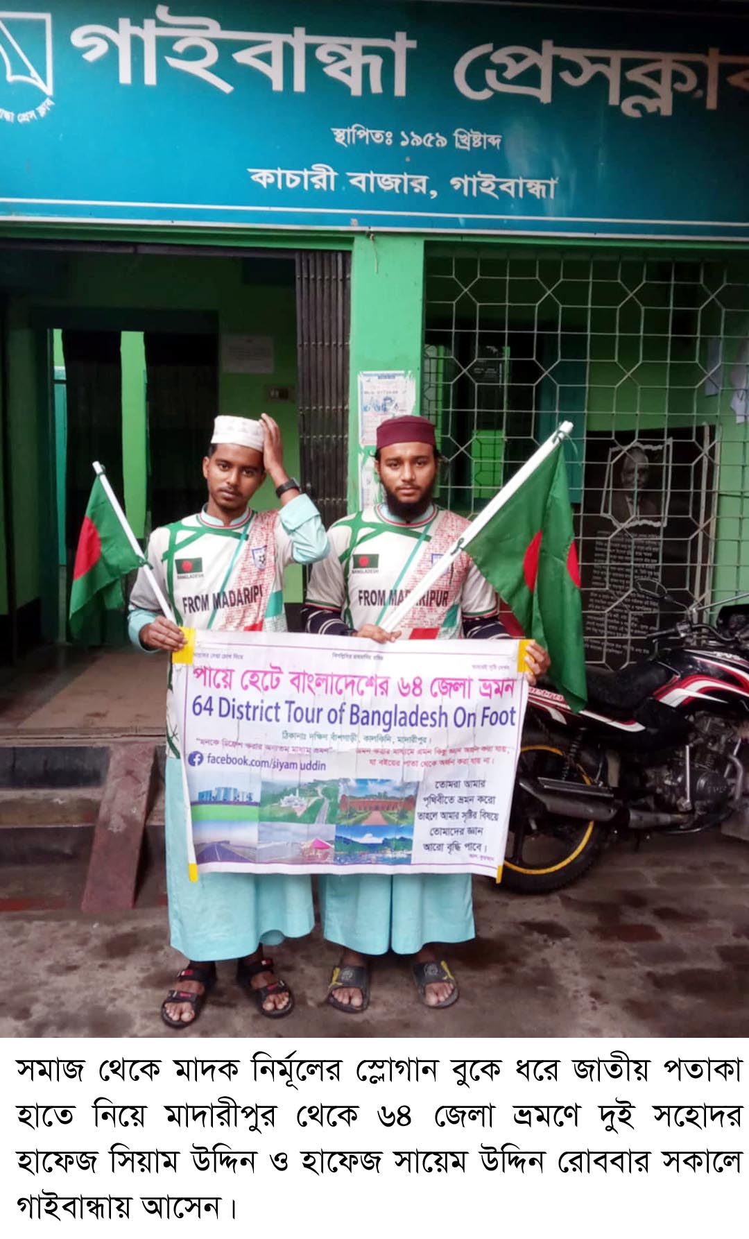 প্রতিনিধি গাইবান্ধ: সমাজ থেকে মাদক নির্মূলের স্লোগান বুকে ধরে জাতীয় পতাকা হাতে নিয়ে মাদারীপুর থেকে ৬৪ জেলা ভ্রমণ শুরু করেছেন ReadMore..