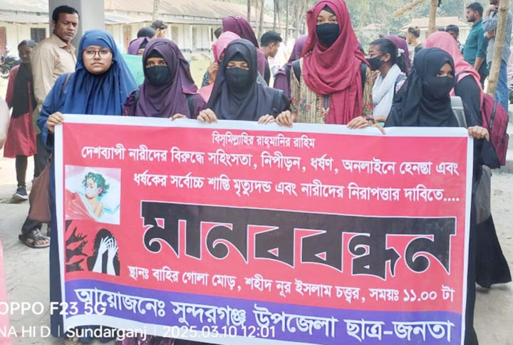 দেশব্যাপি নারীদের নিপীড়ন, ধর্ষণ ও সহিংসতার প্রতিবাদে সুন্দরগঞ্জে মানববন্ধন