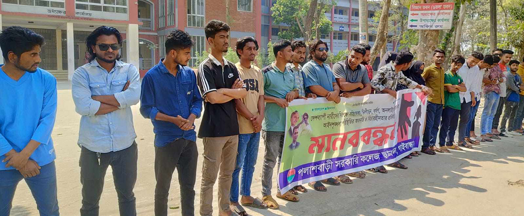 পলাশবাড়ী (গাইবান্ধা) প্রতিনিধিঃ দেশব্যাপী নারীদের বিরুদ্ধে সহিংসতা-নির্যাতন-নীপিড়ন-ধর্ষণ এবং অনলাইনেহেনস্থা এবং আইনশৃঙ্খলা পরিস্থিতি অবনতিসহ বিচারহীনতার প্রতিবাদে গাইবান্ধার পলাশবাড়ী সরকারি কলেজ ছাত্রদলের